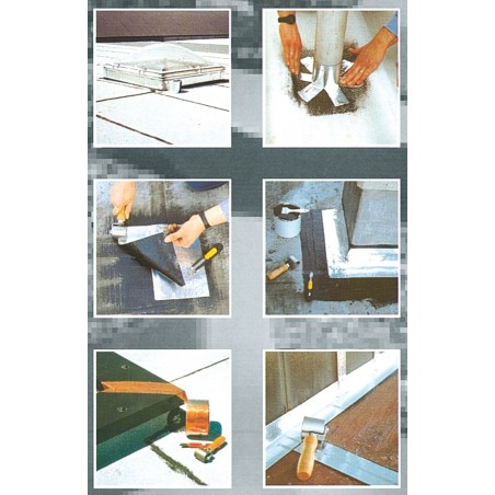 Membrana bituminosa autoadesiva autoprotetta con film di alluminio. Utilizzabile per impermeabilizzare tetti e pavimenti, prefabbricati, sigillare lucernai, copole e vetrate, riparare tubi di raccolta acqua, ecc. Resiste ai raggi UVA.